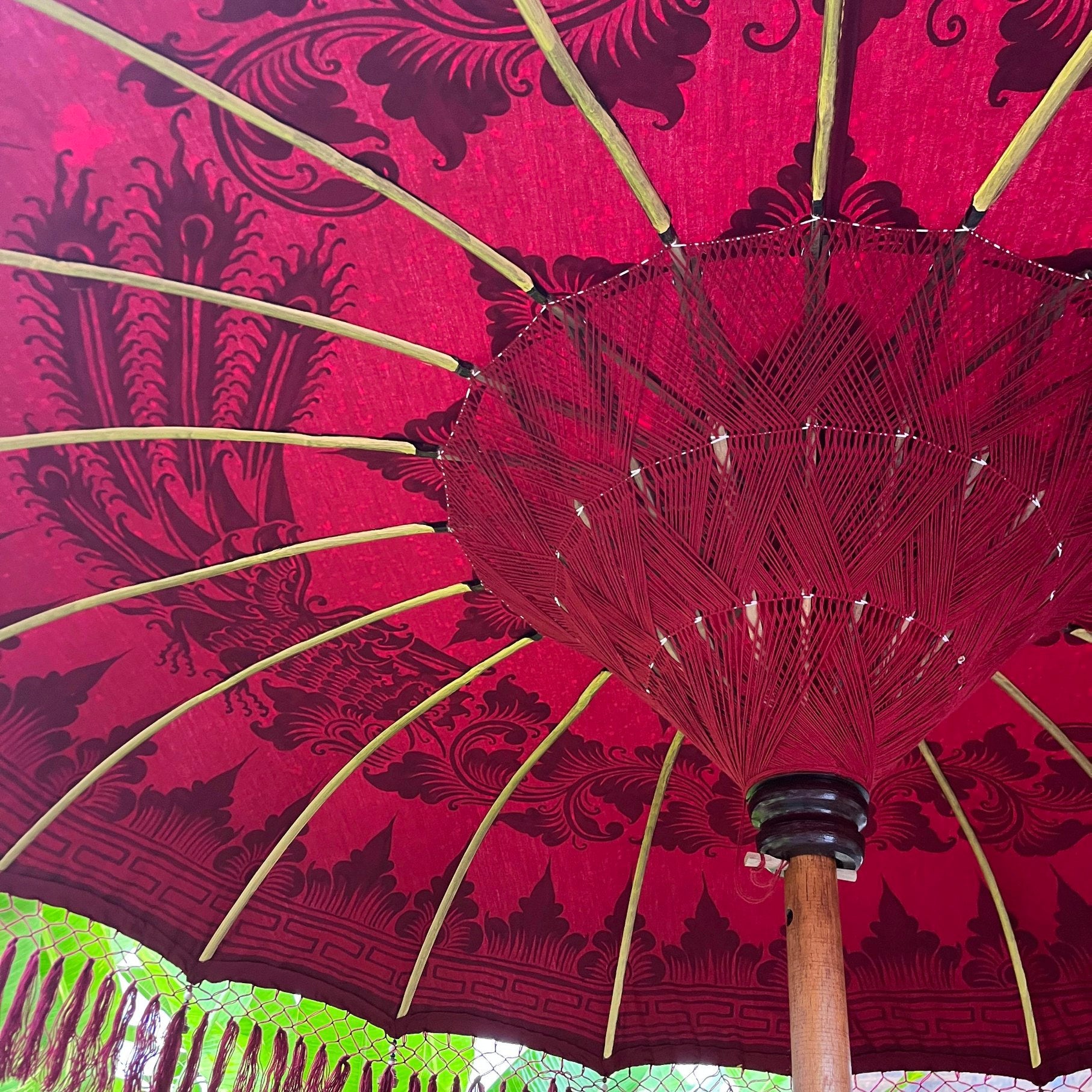 Handmade in Bali, our authentic Balinese umbrellas (Tedung) are more than just a decoration they're a piece of art. Each parasol is meticulously crafted by local artisans from high-quality materials like cotton, wood, and bamboo, ensuring every piece is unique with its own small, beautiful imperfections.