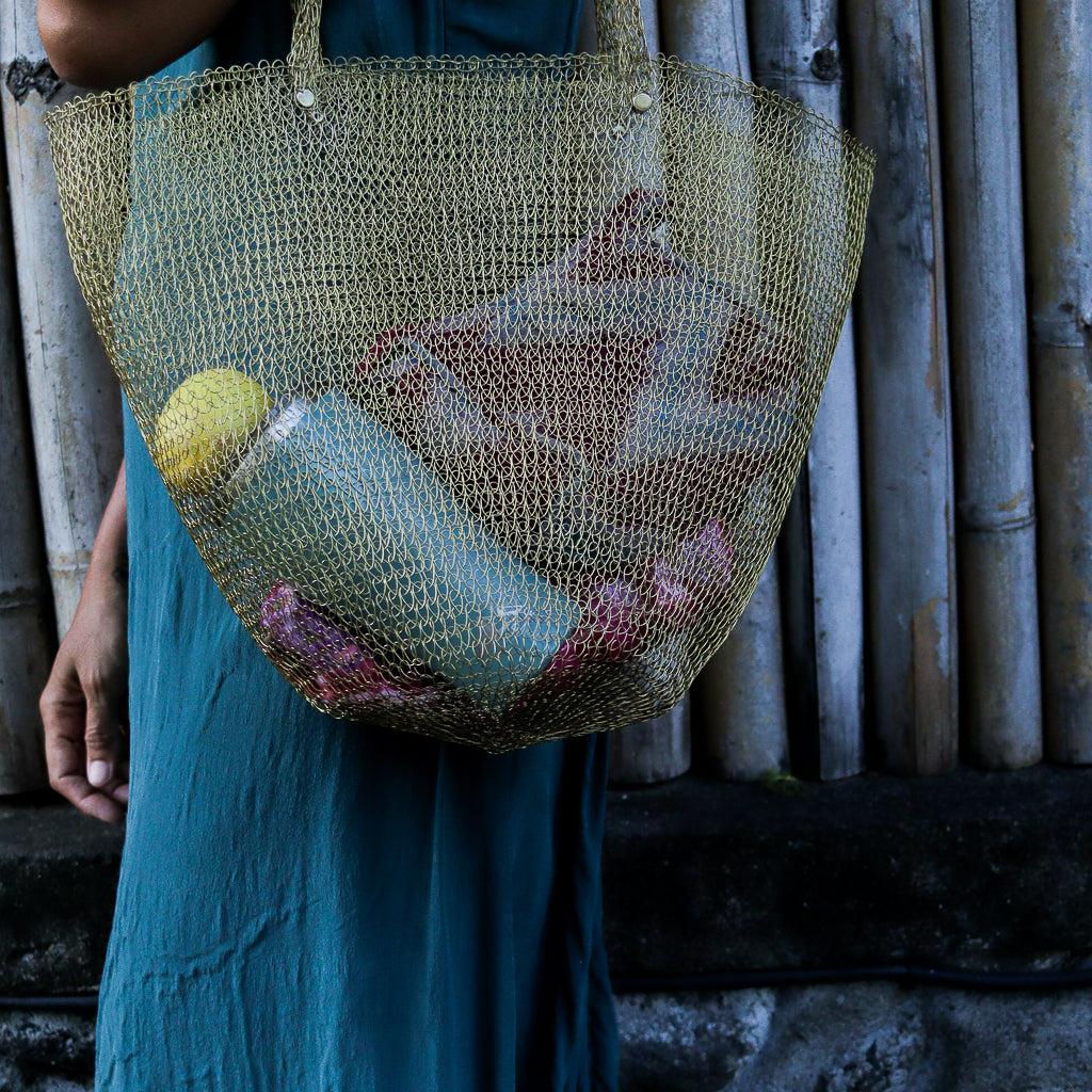 Say goodbye to plastic! Our brass tote is the ultimate eco-friendly bag and a sophisticated alternative to traditional carriers. Perfect as a striking market bag, beach tote, or everyday sustainable handbag.